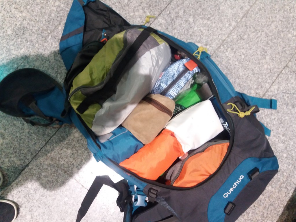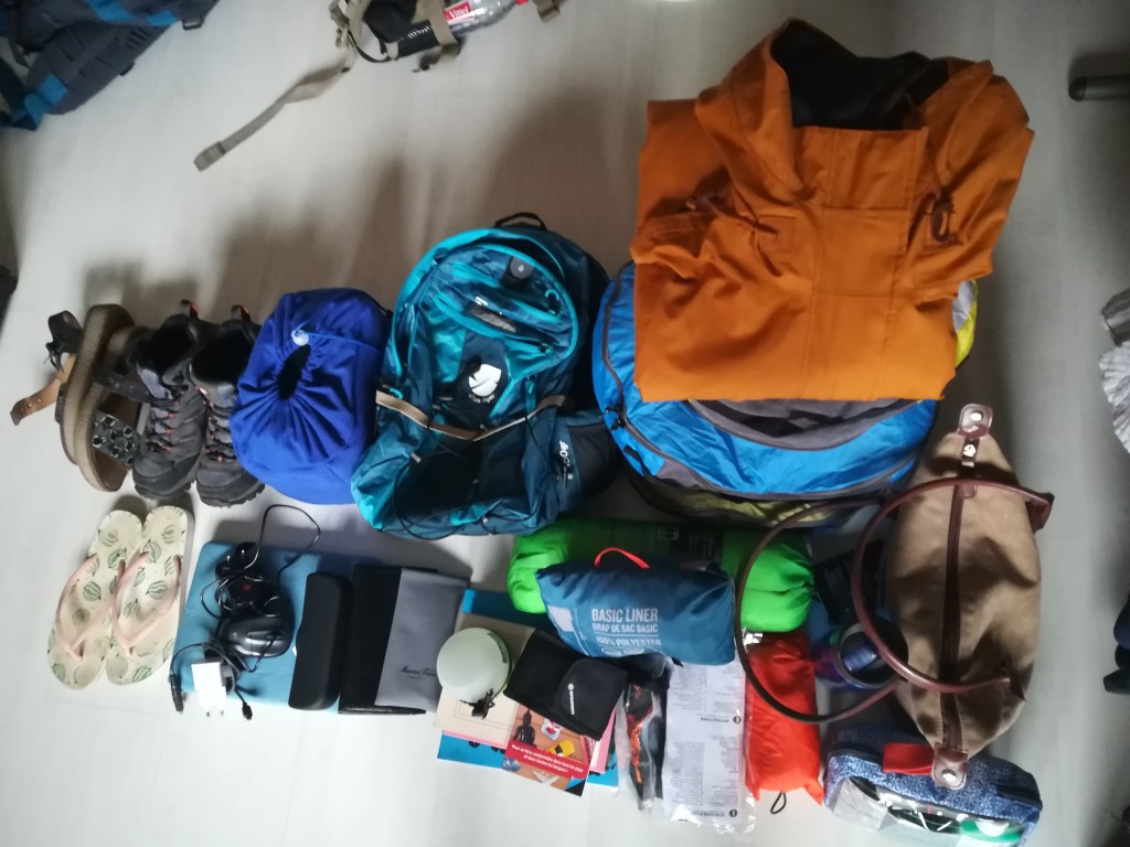 La dernière semaine avant le départ n’a pas non plus été de tout repos ! Elle a été consacrée aux équipements. Nous avions depuis un moment mis de côté ce que nous voulions emporter. Quelques achats de dernières minutes ont tout de même été nécessaires. Il a surtout fallut tout faire rentrer dans nos sacs… Et faire quelques concessions. Au revoir petites jumelles et peignoir microfibre ! Au total, pour un voyage de 11 mois, nous avons chacun un sac de 60 litres qui pèse 15 kg.