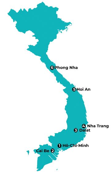 Après avoir rejoint le littoral, nous longeons ce dernier jusqu’au centre du Vietnam. Cette région est connue pour ses richesses culturelles, autour notamment de la jolie ville d’Hoi An(5), dont le centre est classé au patrimoine mondial de l’UNESCO. Elle abrite aussi un parc national, Phuong Nha(6), où l’on peut découvrir quelques-unes des plus grandes grottes du monde !