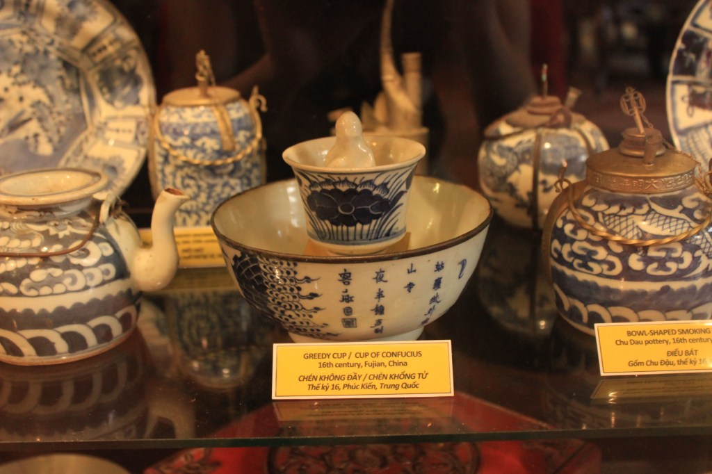 A propos d’Hoi An, tous les voyageurs sont unanimes pour évoquer le charme de ses ruelles. Cet ancien petit port de commerce s’est construit à la lisière de différentes cultures : celles des marchands de plusieurs pays asiatiques qui débarquaient sur cette terre. Dès le XVème siècle, il s’agissait surtout de Chinois et de Japonais. Il en résulte des enfilades de façades jaunes qui dessinent un centre-ville très mignon. On s’y laisse volontiers flâner et tomber sur quelques temples, musées et marchés. Lors d’une de nos visites, nous découvrons la tasse de Confucius, qui relate en boisson la philosophie de ce dernier. Au milieu de cette tasse, une petite statuette ; à son socle, un petit trou. Si on remplit raisonnablement la tasse, rien ne se passe, on peut boire tranquillement. Si on la remplit trop, tout le liquide s’écoule en dehors. « Si on désire trop, on risque de tout perdre » disait l’autre.