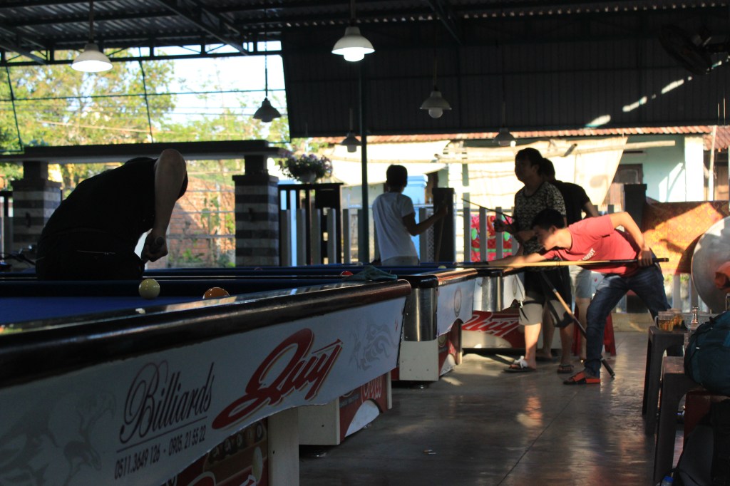 Hoi An dévoile aussi quelques richesses à l’extérieur de son centre-ville. Ici la circulation permet de prendre le vélo. On se régale en pédalant au milieu des rizières. Dans une bourgade, un endroit réunit de nombreux hommes du village. Nous nous joignons à eux pour découvrir le billard à trois boules. Et oui, il aura fallu attendre un séjour au Vietnam pour s’initier au billard dit « français »…