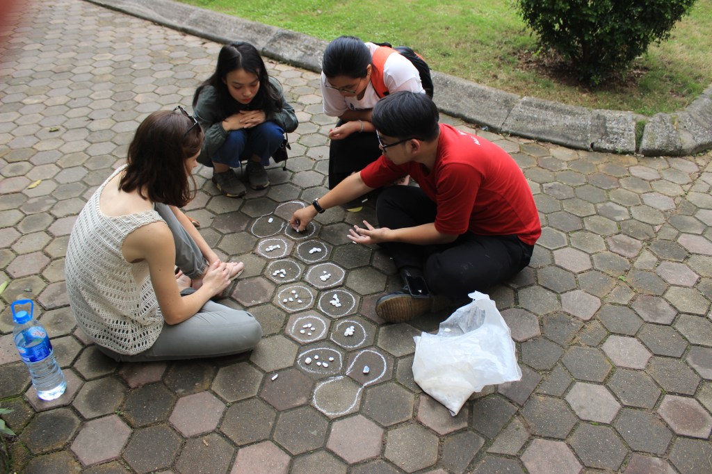 Le second jeu auquel nous avons joué est le O An Quan, le jeu du Mandarin. C’est un dérivé du jeu du Mancala dont les premières traces ont été découvertes en 10 000 AV JC ! Pas besoin de grand-chose, juste une craie et des cailloux. Par contre il faut être prêt à faire beaucoup de calculs !