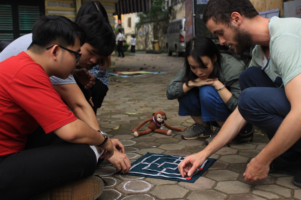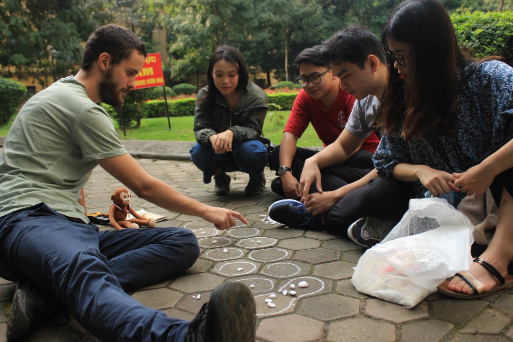 Si vous voulez vous aussi vous plonger dans la culture vietnamienne, vous avez désormais tous les éléments pour construire et tester ces jeux par vous-même. De notre côté, nous avons mis ce principe en action, en fabriquant notre propre jeu du moulin (jeu français dont vous pouvez retrouver la fiche ici). L’occasion de tester nos talents en négociation dans les commerces d’Hanoï et de faire nous aussi découvrir un jeu à nos amis vietnamiens. Encore merci MyHanoi pour ce joli moment d’échange !