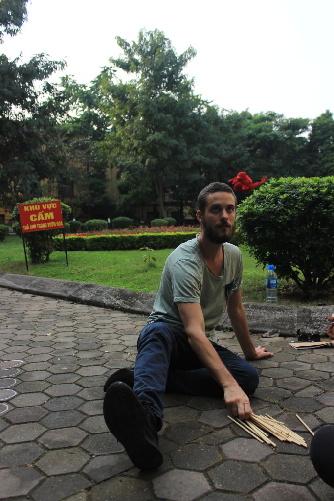 Nos amis ont aussi voulu nous tester sur des jeux d’adresse, et notamment le Choi Chuyen. Traduisible en français comme le jeu des bâtonnets, il faut lancer en l’air une petite balle et attraper un certain nombre de bâtonnets de bambou avant que celle-ci ne touche le sol. Et ce, avec la même main !