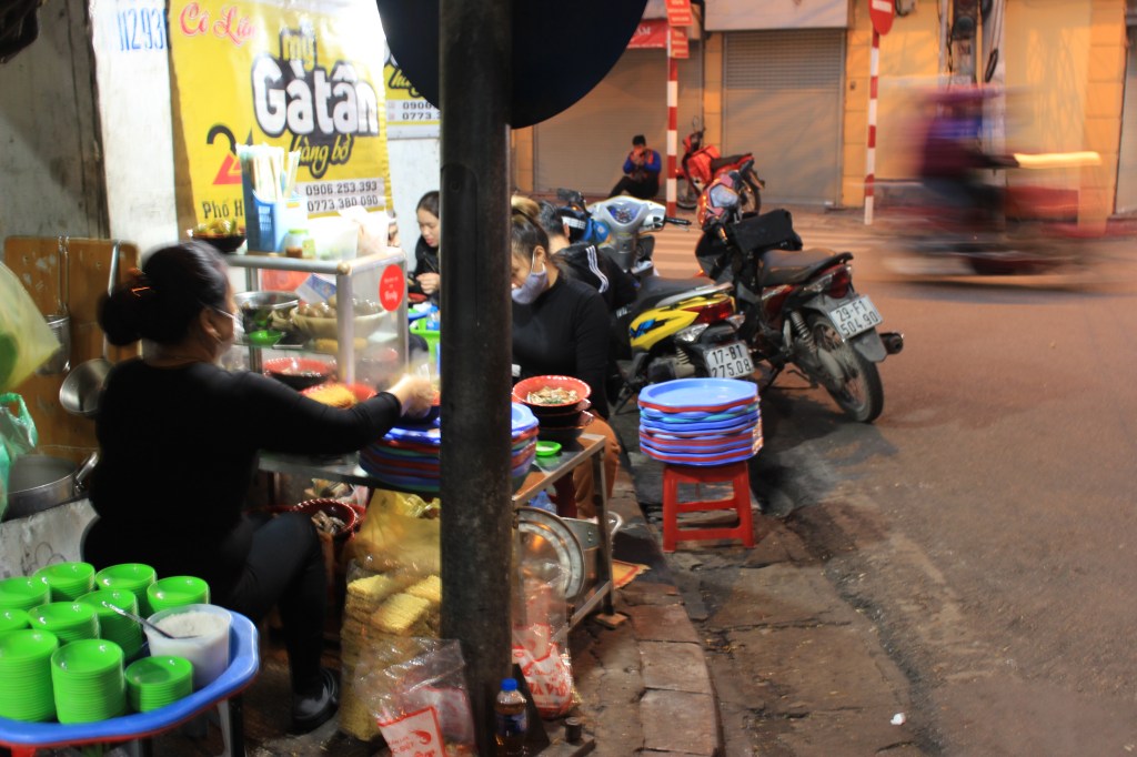 Dernier élément, et pas des moindres, pour fixer le décor : la nourriture de rue, alias « street food ». Caractéristique d’Hanoï comme de tout le Vietnam, on ne vous en a pas encore parlé mais on en a bien profité ! C’est un plaisir autant visuel, olfactif que gustatif de voir dès le matin s’installer toutes ces cuisines ambulantes avec leurs petits tabourets en plastique.