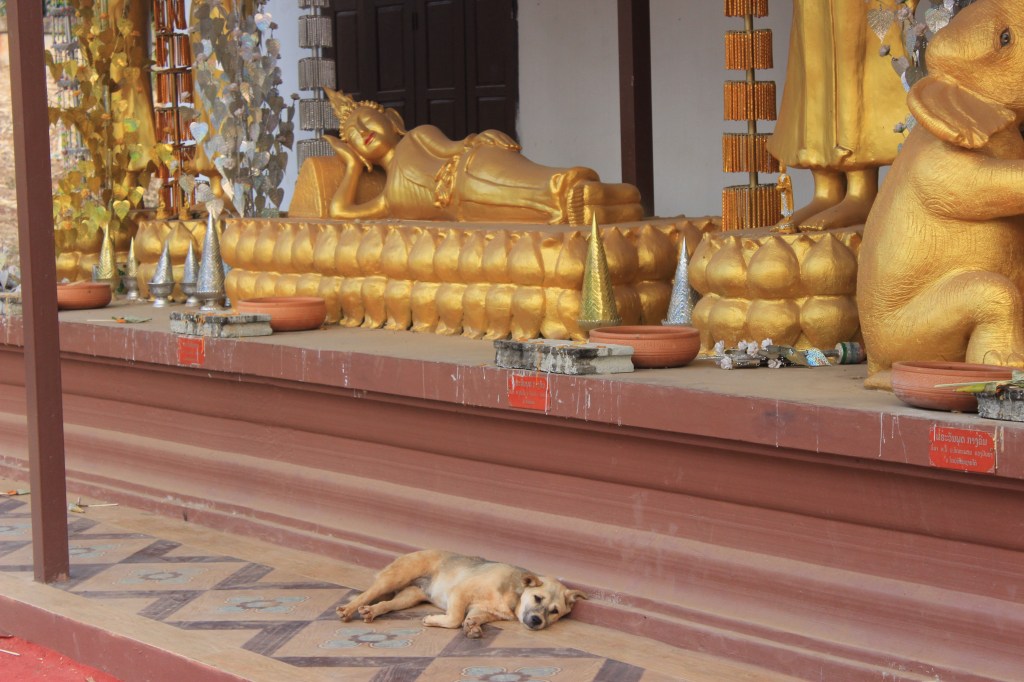 Au Laos, l’espace public est très marqué par la religion. Les temples magnifient chaque petite ville. On y trouve des représentations de Bouddha toutes plus impressionnantes les unes que les autres. Il arbore de nombreuses positions, chacune représentant une scène de son histoire. Le Bouddha couché représente par exemple le chef spirituel dans sa dernière maladie qui mettra fin à son existence physique et le mènera au nirvana. Bon, certains y voient plutôt une invitation à la sieste…