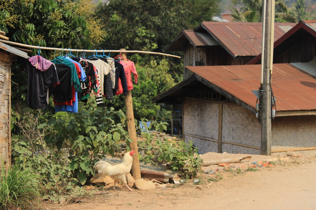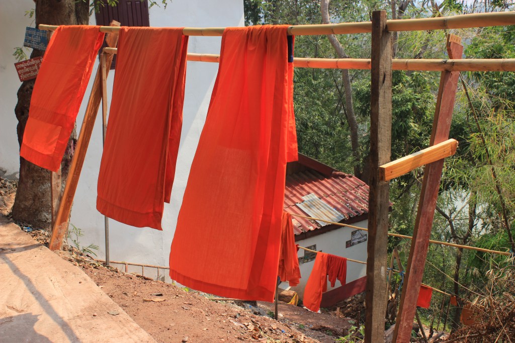 Tous ces lieux de culte sont incroyablement vivants. Ils abritent des moines, dont la présence se devine parfois par des lignées de draps orange laissés à sécher en plein air. De belles images, qui s’assimilent aussi au coton fraîchement fabriqué étendu dans les petits villages du Nord. Le textile colore plus largement les devantures des habitations où le linge sèche en donnant de l’ombre aux poulettes.